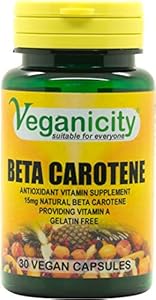 - • Potency: High strength 15mg beta carotene per capsule, described as a powerful antioxidant
