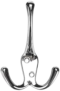 Three evenly spaced hooks are formed from chrome plated metal, allowing separate hanging for hats, coats and scarves. The layout keeps items from overlapping on the same peg.
