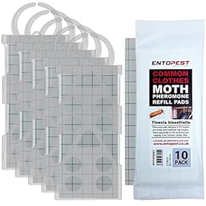 Pheromone pads attract male Common Clothes Moths for monitoring only. Kit includes 10 refill pads and 5 reusable clear hangers for flexible placement.