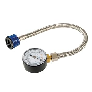 Measures mains water pressure from 0-11 bar (0-160 psi) using a corrosion-resistant gauge and braided 300mm stainless steel hose. 9mm bore diameter and a 3/4" connector allow straightforward attachment to standard plumbing fittings for diagnosis and localisation of faults.