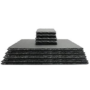 A 16-piece slate set contains eight rectangular placemats and eight square coasters. Hand-wash or wipe clean, with anti-slip feet and a two-year manufacturer's warranty.