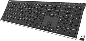 Ultra-slim stainless steel full-size wireless keyboard with numeric keypad and nano USB receiver. Rechargeable lithium battery rated for up to six months between charges based on two hours of daily use.
