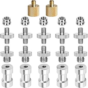 - Included adapters: 5x 1/4" to 3/8" reducer bushings; 5x 1/4" external thread to 3/8" external thread; 5x 1/4" external thread to 1/4" external thread; 5x camera screws; 2x 1/4" male to 3/8" female brass screws