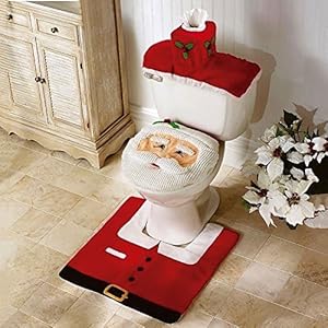 Three-piece set includes a toilet seat cover, a floor rug and a tank cover. Elastic edges aim to secure the pieces to standard toilets for a festive seasonal display.