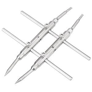 Curved arms lock into screw holes while the tool is secured by round head screws, preventing slippage. Three rows of holes allow the spanner to grip recessed screw patterns for a firmer hold.
