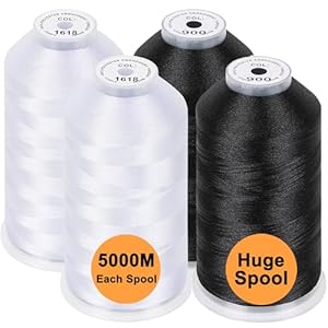 Four huge spools, each 5000 metres and 40 W.T. (120D/2), made from 100% polyester. Suggested average running speed is around 800 stitches per minute, home users should use a thread stand for proper feeding.