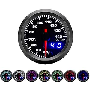 Dual readouts combine a dial pointer and digital numbers to show oil temperature between 40°C and 140°C. Seven-colour LED backlight is adjustable for clear visibility at night and fits standard 52mm dash holders on 12V cars.