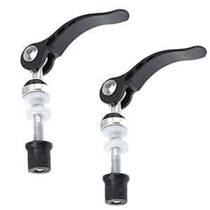 Quick-release skewers with a knurled fingertip nut enable fast locking and unlocking. Aluminium alloy construction reduces corrosion risk and keeps parts durable for regular use.