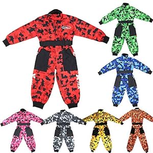 One-piece junior camo race suit with a soft inner lining and a durable outer layer. Oxford fabric is washable and bright designs stay prominent.