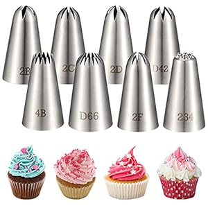 Made from 304 high-quality stainless steel with a seamless finish. The set includes eight large piping nozzles that are dishwasher safe and reusable for cakes, cupcakes, cookies and pastries.
