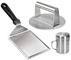Three-piece griddle kit includes a 6.2-inch round press, 6x5-inch large spatula and a dredge shaker. Smooth flat press bottom ensures uniform thickness while the spatula has a wide support surface and a heat-resistant handle.