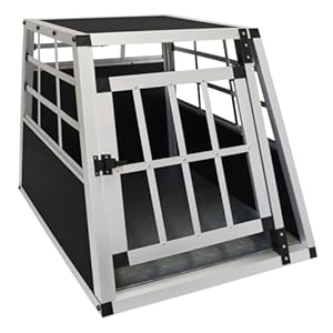 Aluminium trapezoidal travel crate intended for car journeys. Practical solution for pet owners seeking space-conscious containment.