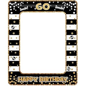 Printed black and gold graphics identify the frame as a 60th birthday prop and create a clear, celebratory border for photos. Design catches light and helps subjects stand out against varied backgrounds.