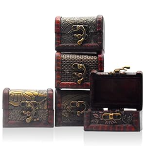 Hand-made with careful workmanship and a retro pirate-chest design. A set contains five small wooden boxes, each with a firm double hinge and brightly dyed interiors.
