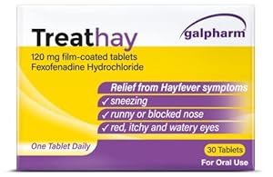 A drugstore treatment for seasonal allergies, Galpharm Treathay Hayfever Relief Tablets target sneezing, runny or blocked nose and itchy, watery eyes. Clearer days outdoors and less irritation at work or school are possible outcomes for sufferers. Is the 120mg fexofenadine formulation the right match for you or for teenagers?