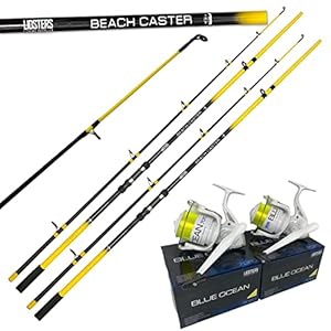 Set includes two 12ft two-piece Beachcaster rods and two BLUE OCEAN 70 reels. Reels have two ball bearings and a 3.9:1 gear ratio, and rods come in a yellow and black finish.