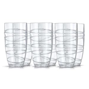 Set of six transparent hi-ball tumblers, engineered to be stronger and lighter than glass. Each glass measures approximately 8 x 5 x 15cm with a weight near 96g.