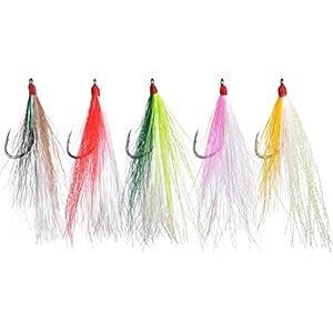 Pre-rigged bucktail teasers with crystal flash arrive in five colours for quick rigging. Sharp, high-carbon steel hooks are described as strong and corrosion-resistant for saltwater use.