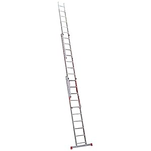 A three-section extension ladder made from lightweight aluminium with a 150kg maximum load rating. Auto-locking clips and a stabiliser bar aim to reduce bounce and improve safety when working at height.