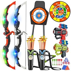- Contents: 2 bows with LED lights, 2 targets, arrows and darts