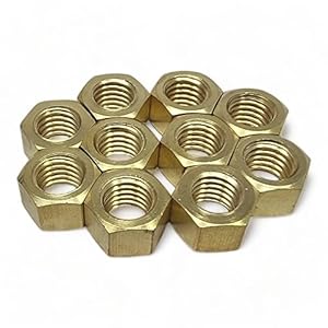 Ten brass manifold nuts in 5/16 UNF size designed for high-temperature manifold and turbo applications. Brass construction reduces the risk of seized studs and the hexagon shape makes replacements straightforward.
