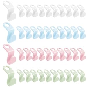 Pack of 40 polypropylene connector hooks in four colours, ten of each. Each connector fits hanger hooks under 1cm and links garments vertically to save wardrobe space.