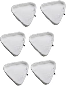 Six triangular microfibre pads are supplied for repeated use with compatible steam mops. Machine-washable construction aims to extend usable life and reduce waste.