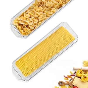 Clear, rectangular containers are designed specifically for long pasta such as spaghetti and lasagna. Food-grade, BPA-free plastic and an easy-grip lid aim to keep contents dry and visible.