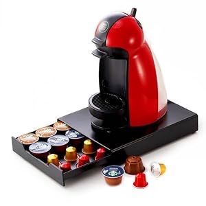 Single smooth drawer stores 20 Dolce Gusto and Nespresso OriginalLine capsules. Durable metal construction with anti-vibration support and a felt, scratch-resistant base protects surfaces.