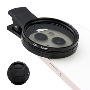Circular polariser clip mounts over a phone lens and rotates to control the polarising effect. High-grade optical glass with an 18-layer coating and ABS mounting keeps images clear and handling durable.