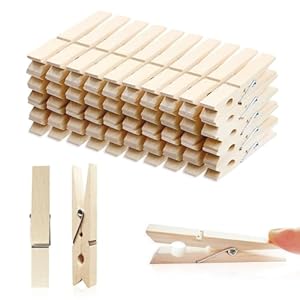 Pack of 50 natural wood clothespins with sturdy stainless steel springs. Smooth edges and anti-slip teeth aim to protect fabrics while maintaining a firm grip.