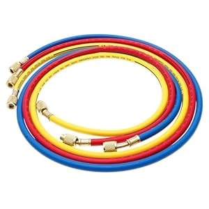 Three 1.5m hoses with brass and rubber construction, supplied in red, yellow and blue. 1/4 SAE connectors suit R134a applications for car and home air conditioners.