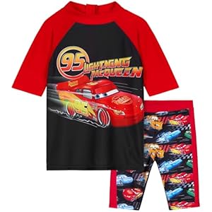 Two-piece set includes a rash guard top and matching trunks with Disney Cars graphics. User reviews highlight a comfortable, true-to-size fit along with sun-protective and non-fading colour qualities.