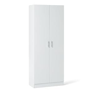Tall freestanding cupboard designed for narrow spaces with two doors. Adjustable shelving adapts storage for tins, bottles and boxes.