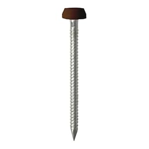 Mahogany-coloured polymer heads sit over the nail shank to present a tidy appearance against brown UPVC. The coloured head avoids an obvious metal contrast.