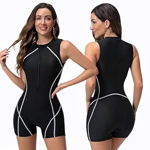 - • Fit & Coverage: Zip-up sleeveless one-piece with above-knee boyleg and built-in removable padded bra, no underwire, for modest coverage and straightforward dressing