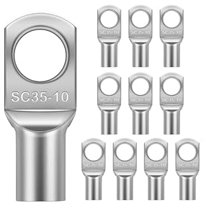 Set of ten SC35-10 tinned copper ring terminals with 10.5mm bolt hole, suitable for 35mm² cable. Heavy-duty barrels, marked sizes and a closed design help protect connections from moisture.