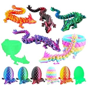 Six 3D-printed eggs each contain an articulated miniature dragon with vibrant colours. Eco-friendly, non-toxic materials and flexible joints suit display and light play.