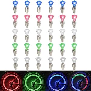 Thirty LED valve caps in mixed colours run on three AG10 button cells each and light automatically when wheels turn. Waterproof testing and an included nozzle converter enable use with American and British valves but not French valves.