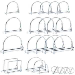 Fifteen D-shape lynch pins are supplied across three diameters and include a storage box. Zinc-plated carbon steel and spring-loaded self-locking rings make the set suitable for outdoor towing and farm work.