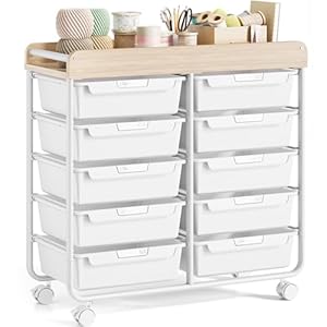 Ideal for crafters, teachers, nail technicians and home organisers who need organised, mobile storage. Ten roomy drawers, a raised-edge wooden tabletop and lockable swivel wheels combine to keep materials tidy and portable. Durable wood-and-metal construction and straightforward assembly suggest strong long-term value for everyday use.