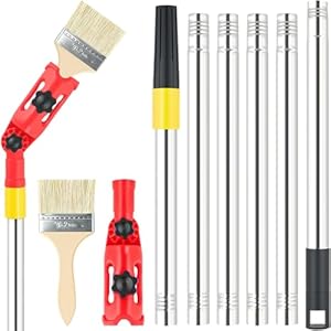 Six extension poles screw together to extend reach for elevated work. A rotatable head and removable brush adapter help access corners and trims.